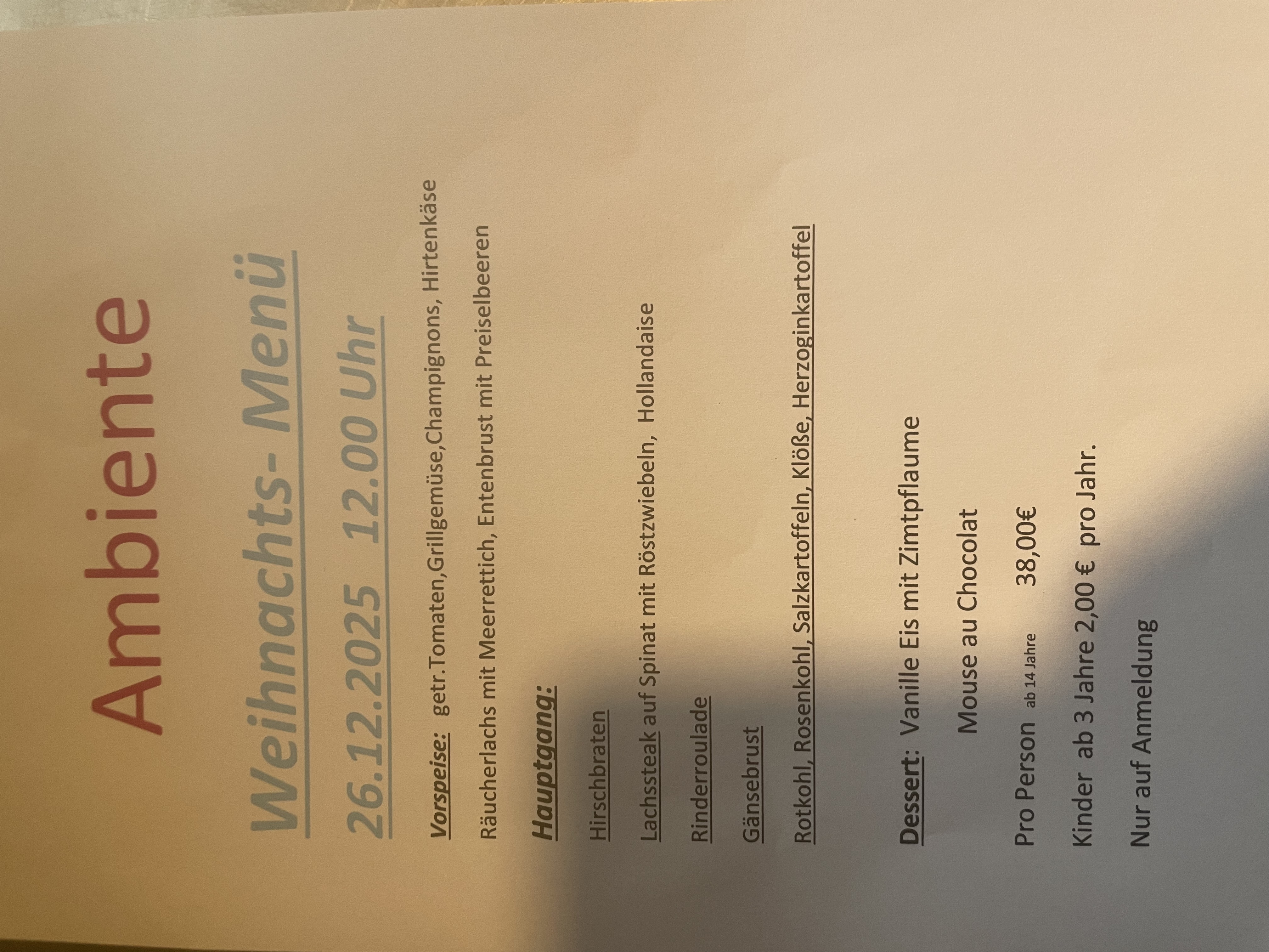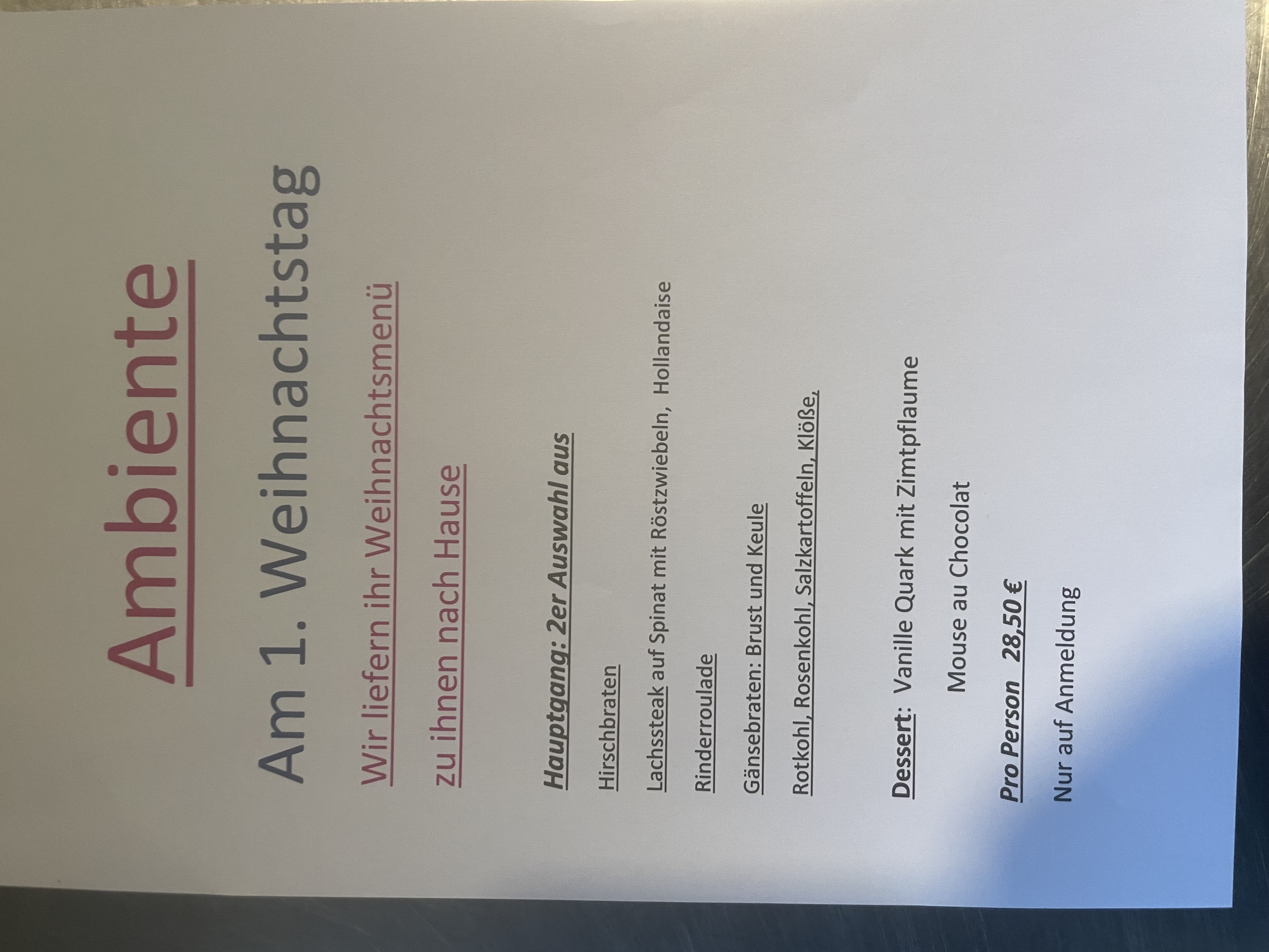 Weihnachten liefern wir wieder unser Weihnachtsmenü am 1. Weihnachtstag mittags zu ihnen nach Hause.